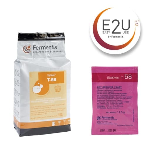 SafAle™ T-58 – Fruity & Spicy Yeast for Belgian and Specialty AlesA specialty ale yeast known for producing strong fermentation character with high esters and phenolic notes of banana, clove, and pepper. Ideal for Belgian-style ales, wheat beers, and other fruity-spicy brews.Attenuation: 72–78%, Alcohol tolerance: 9–11%, Best at 18–26°C. Medium sedimentation with a powdery haze. Suitable for direct pitching or rehydration.