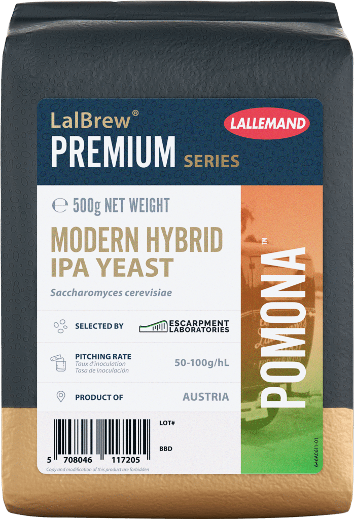 LalBrew Pomona™ – Juicy, Hazy IPA Specialist\A hybrid yeast developed for hop-forward beers, LalBrew Pomona™ delivers vibrant peach, citrus, and tropical fruit notes. Designed for high-ABV and heavily hopped IPAs, it enhances biotransformation and haze while offering strong fermentation performance and stress resistance.